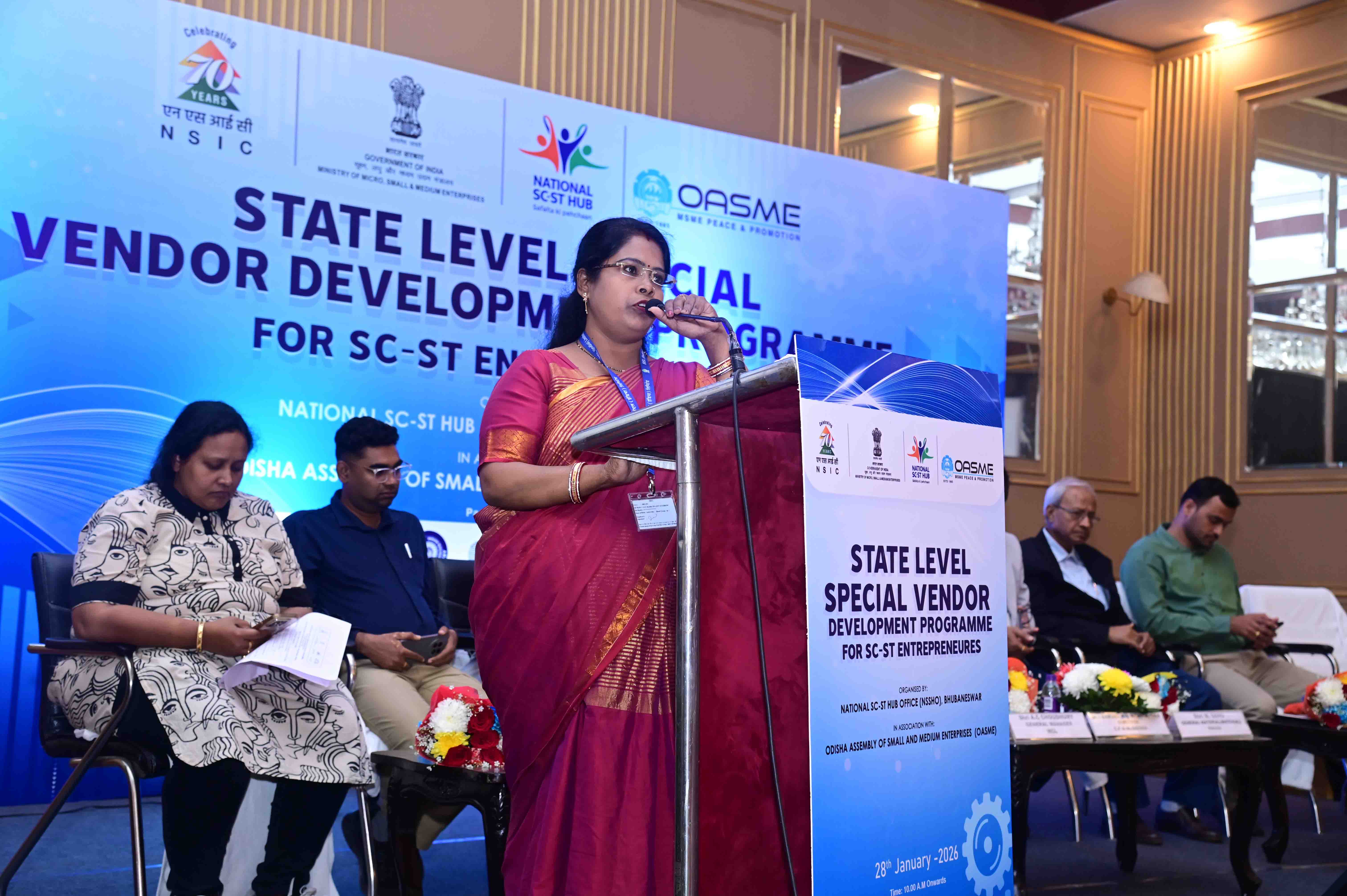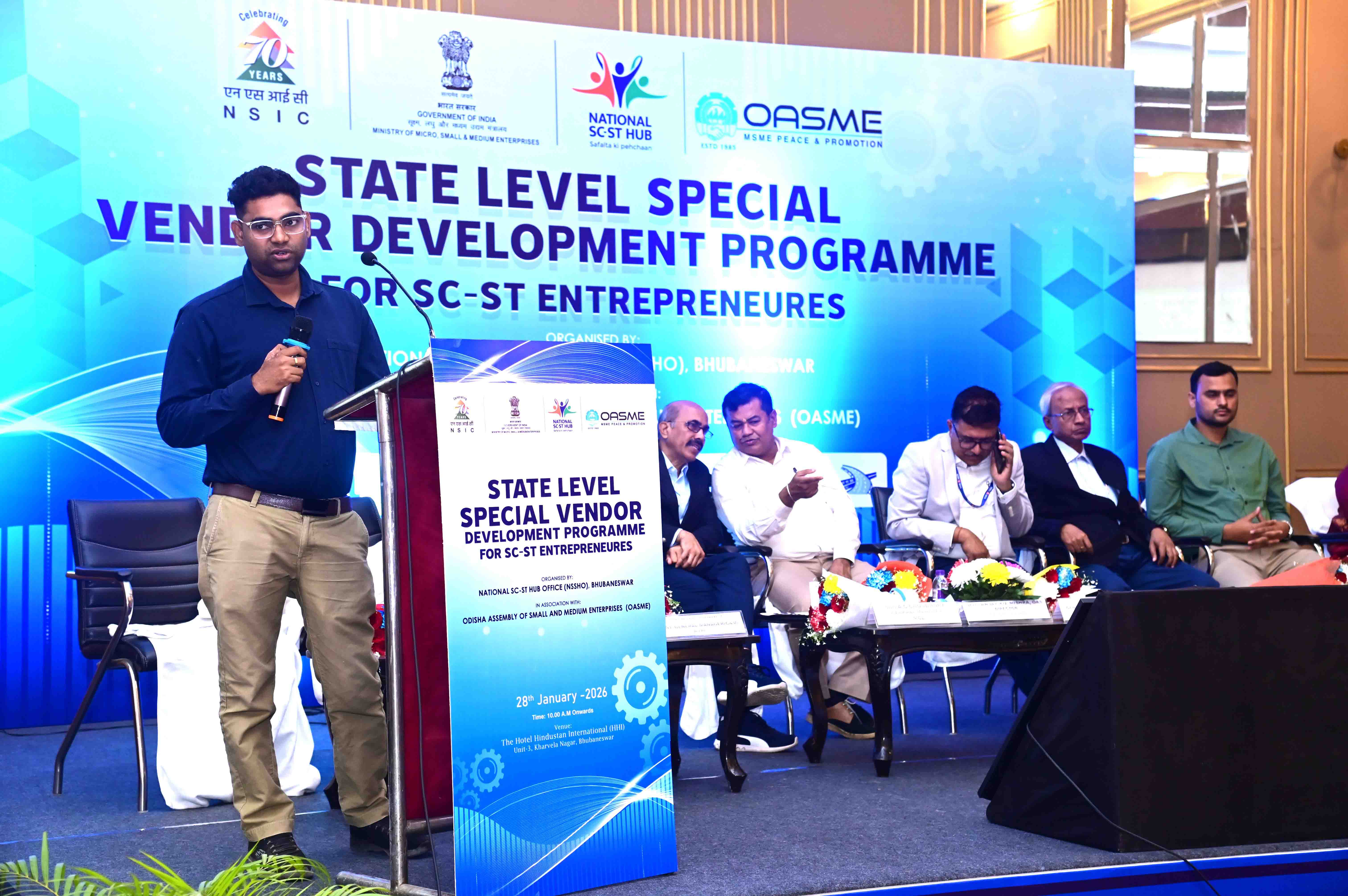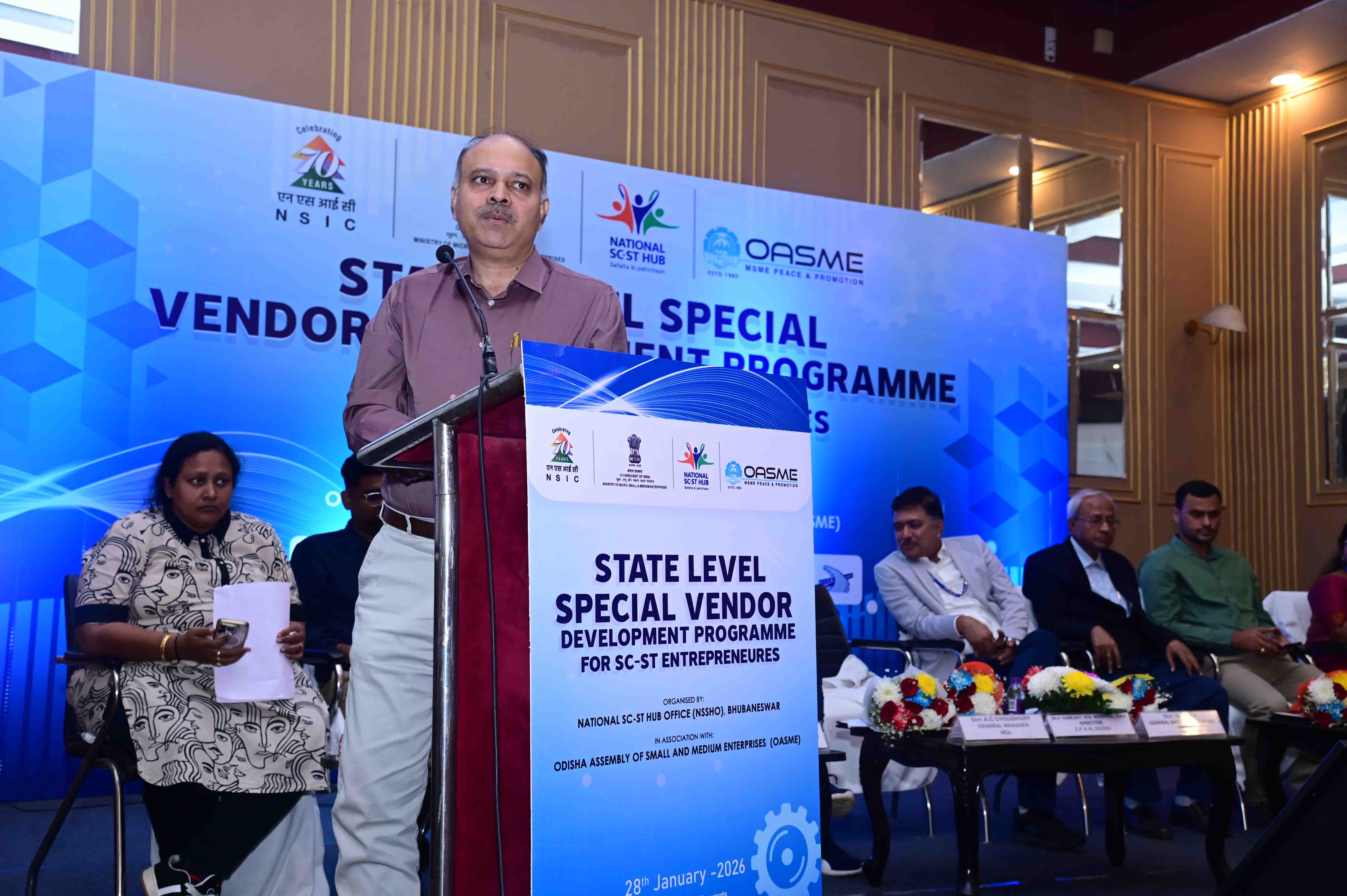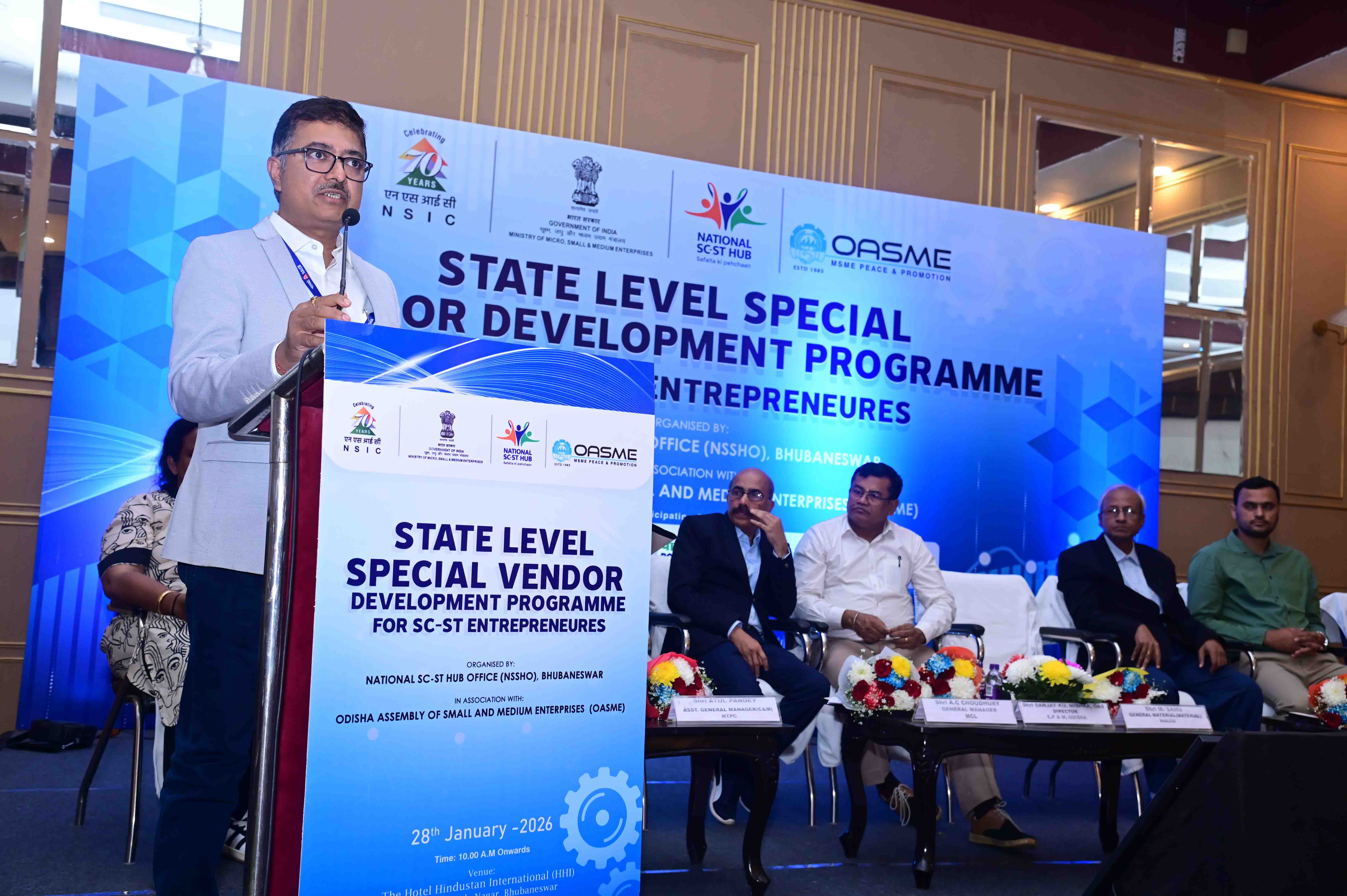 Shri Ananda Kishore Mishra, Trainer, Government e-Marketplace, Bhubaneswar, Odisha is addressing the gathering during the "State Level Special Vendor Development Programme for SC-ST Entrepreneurs" organised by NSSHO, NSIC, Bhubaneswar in Association with OASME on 28.01.2026 at Bhubaneswar