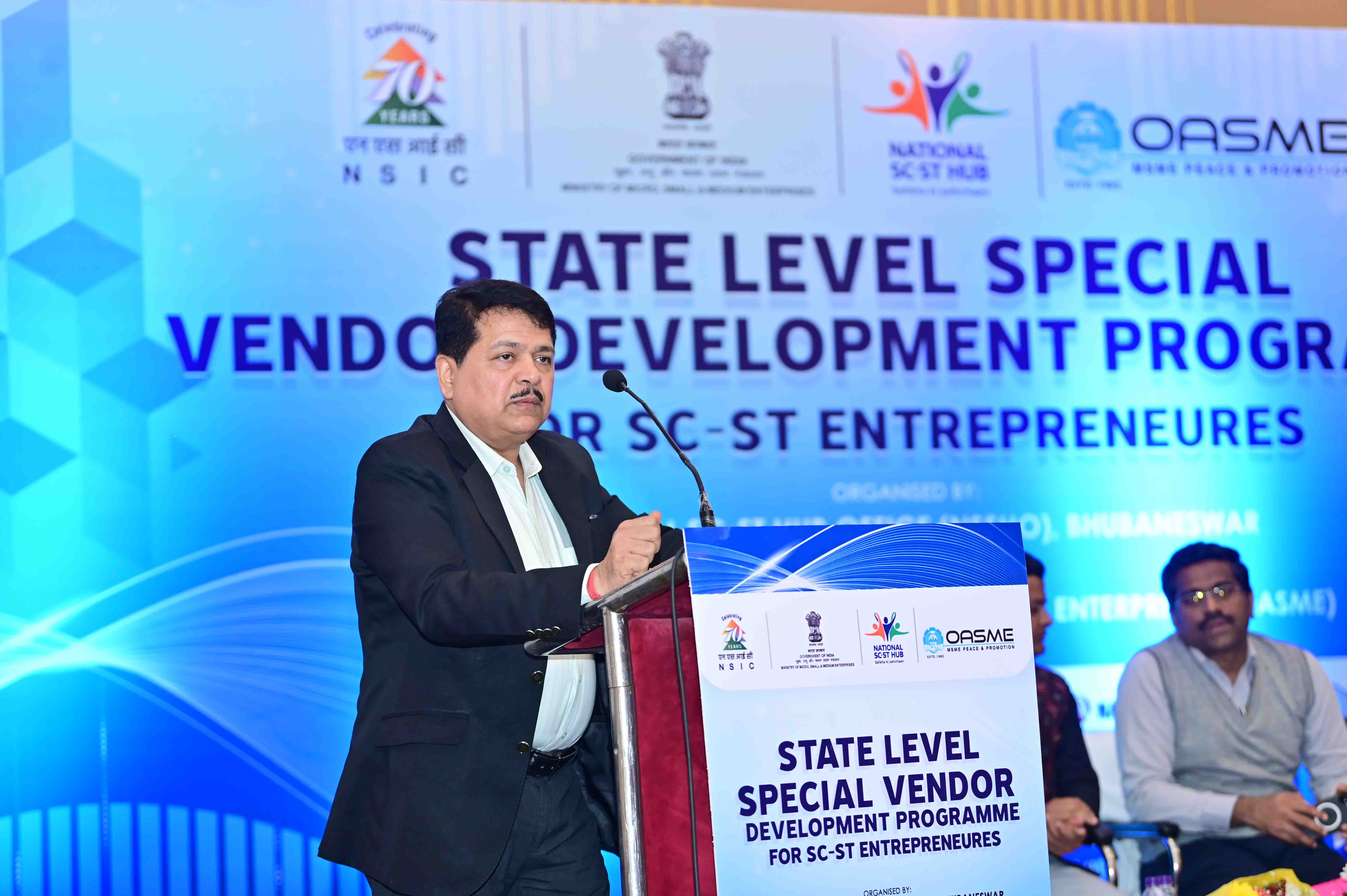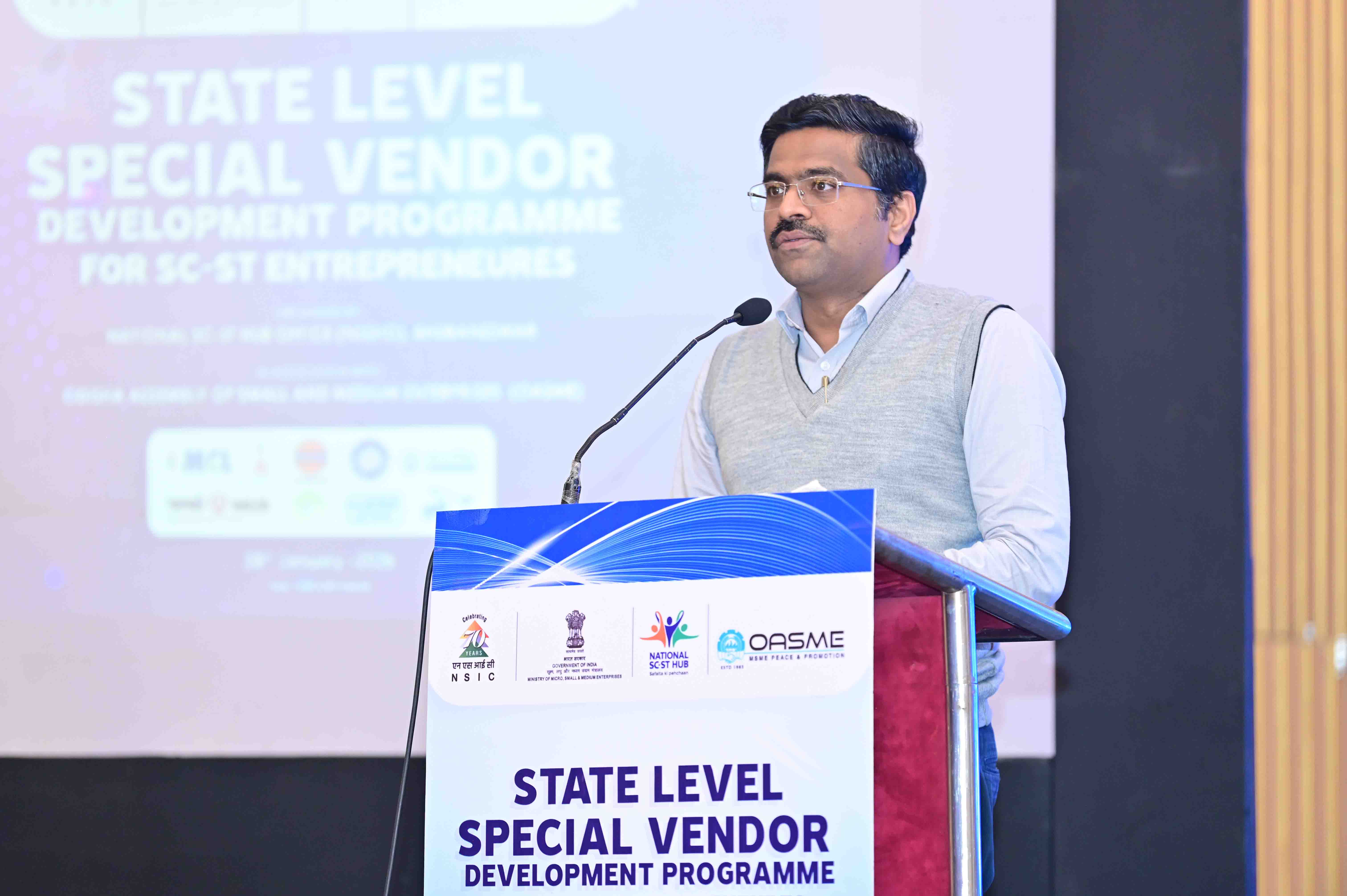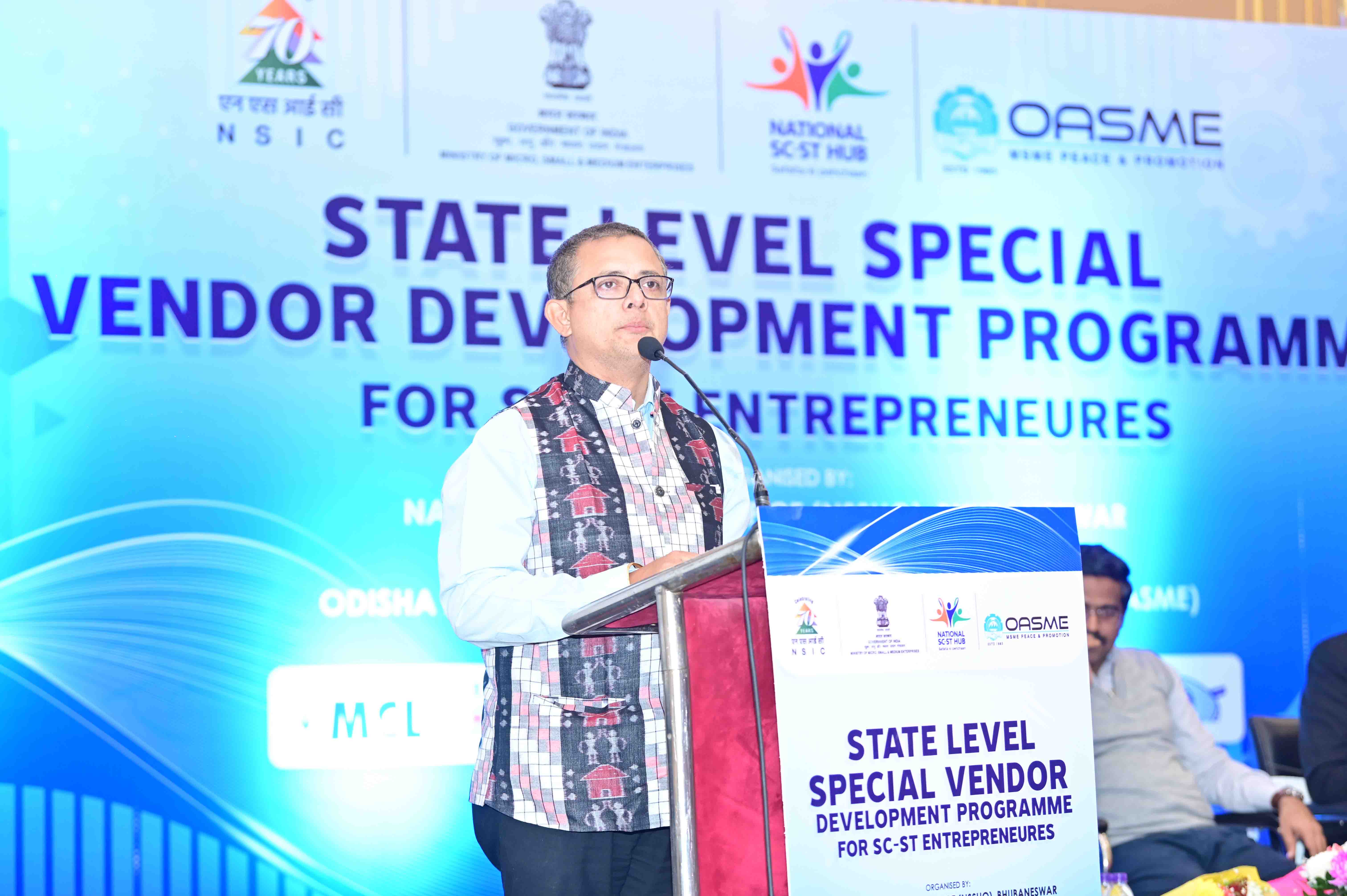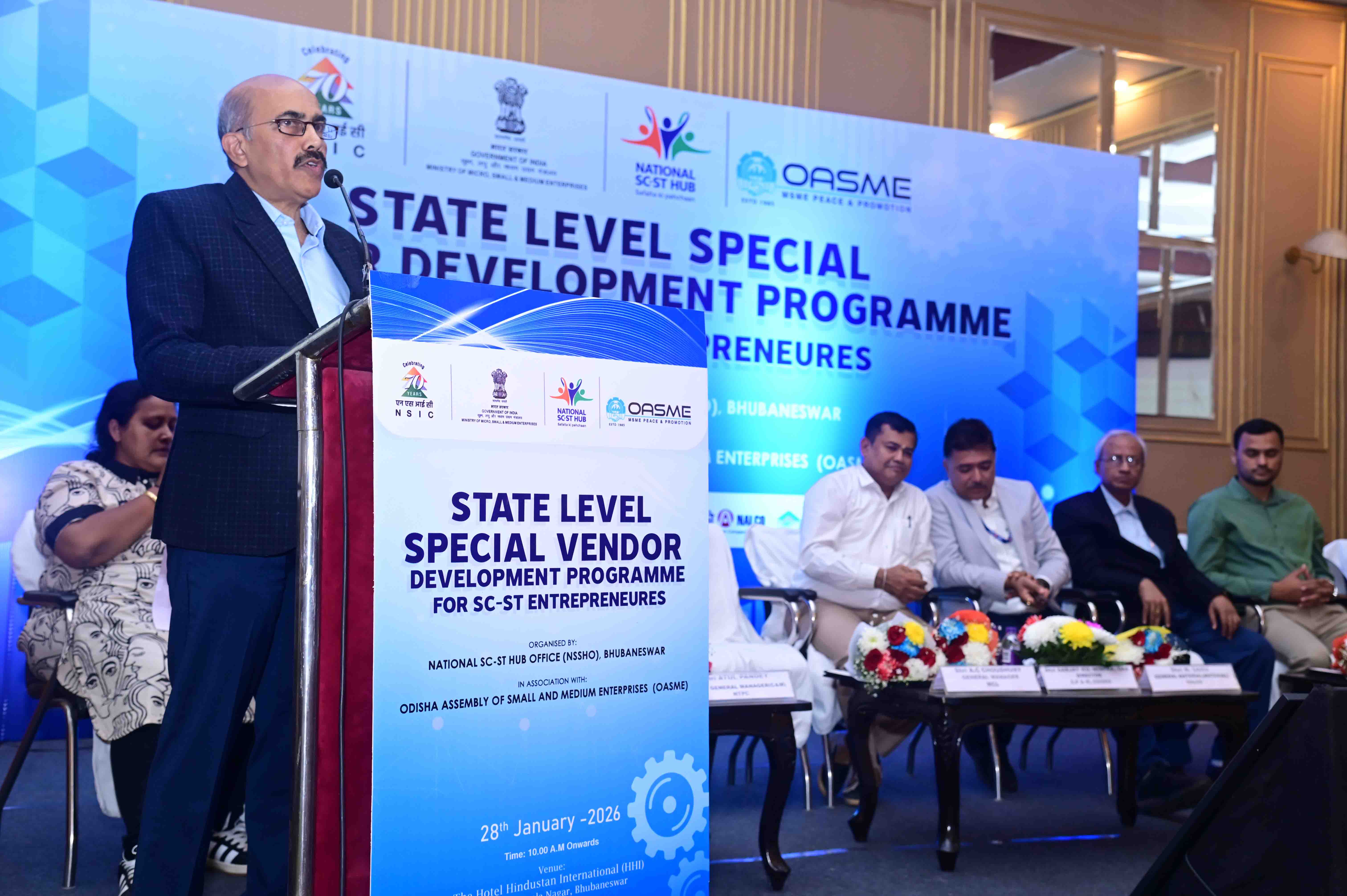Shri Ananda Kishore Mishra, Trainer, Government e-Marketplace, Bhubaneswar, Odisha is addressing the gathering during the "State Level Special Vendor Development Programme for SC-ST Entrepreneurs" organised by NSSHO, NSIC, Bhubaneswar in Association with OASME on 28.01.2026 at Bhubaneswar