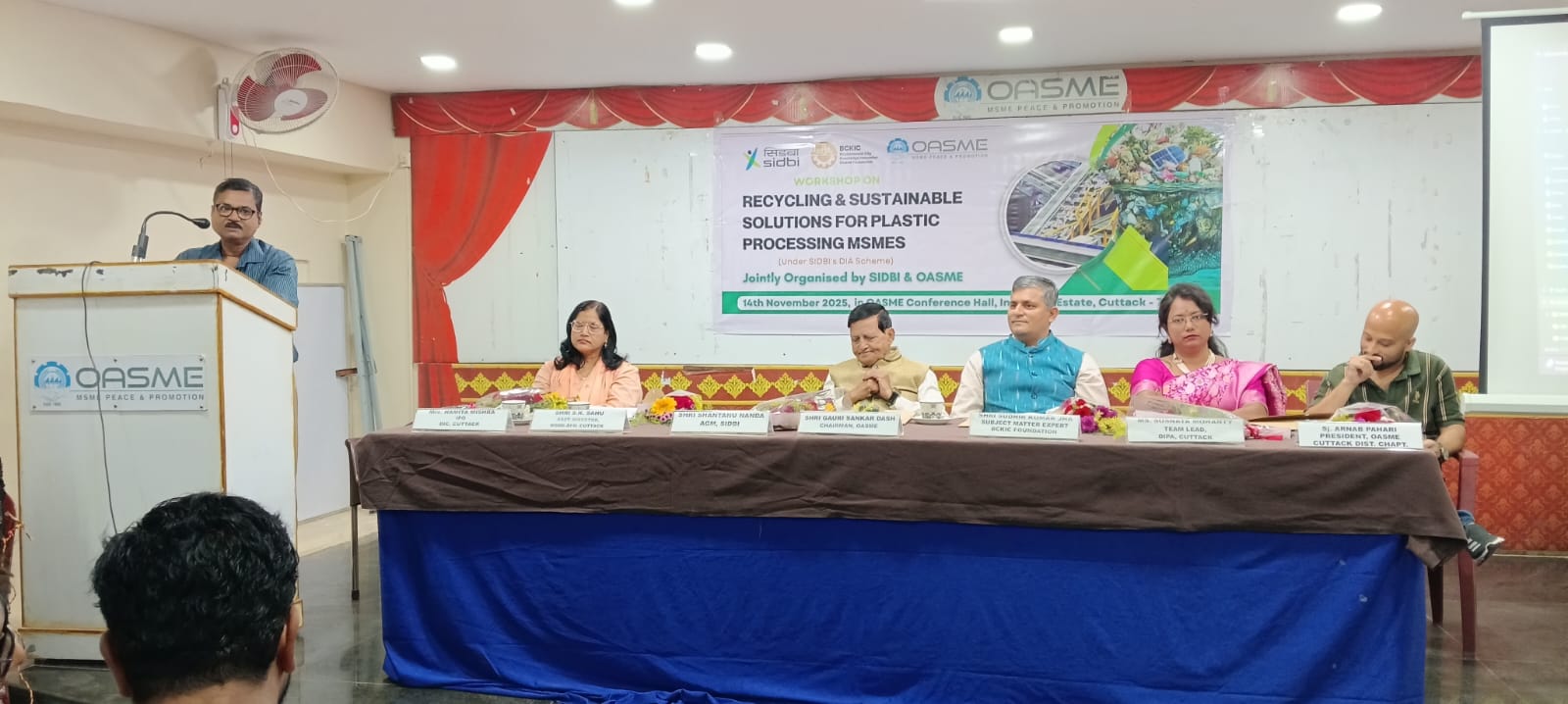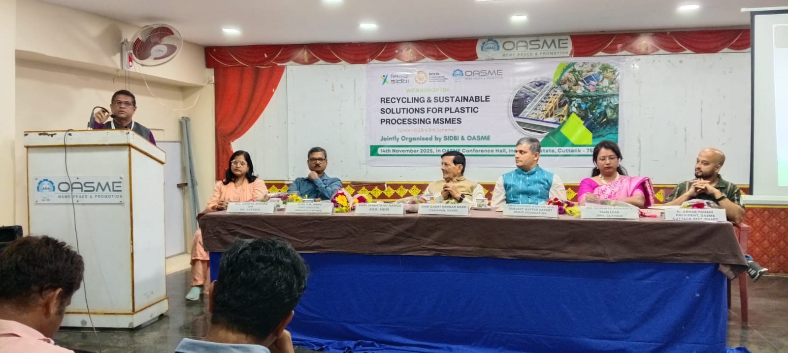 Shri S.K Sahu, Asst. Director, MSME-DFO, Ministry of MSME, Govt. of India, Cuttack is address the gathering during the workshop on "Recycling & Sustainable Solutions for Plastic Processing MSMEs" jointly organised by SIDBI & OASME on 14.11.2025 in OASME Conference Hall, Cuttack